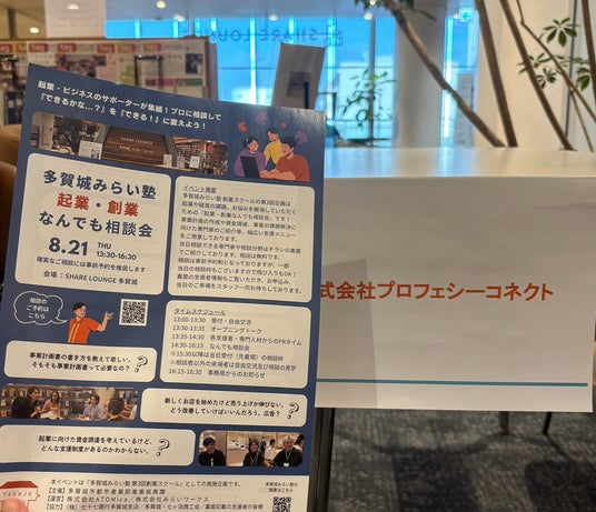 広報代行事業を主とする株式会社プロフェシーコネクト(本社:宮城県多賀城市、代表取締役社長:茅野瞳)は、2025年8月21日に開催された多賀城市都市産業部産業振興課主催の『多賀城みらい塾起業・創業なんでも相談会』にて、広報や在宅ワークの無料相談を実施いたしました。