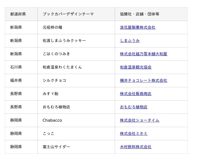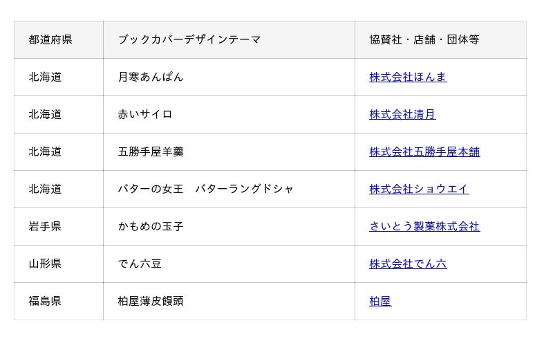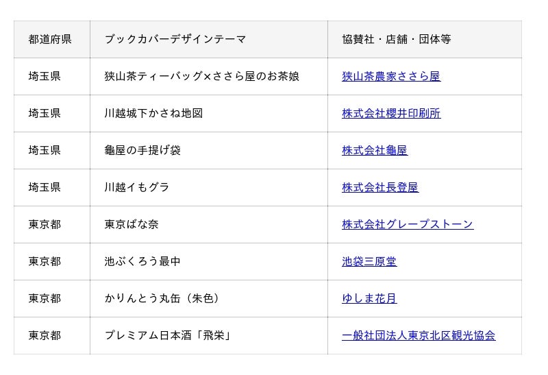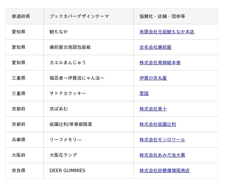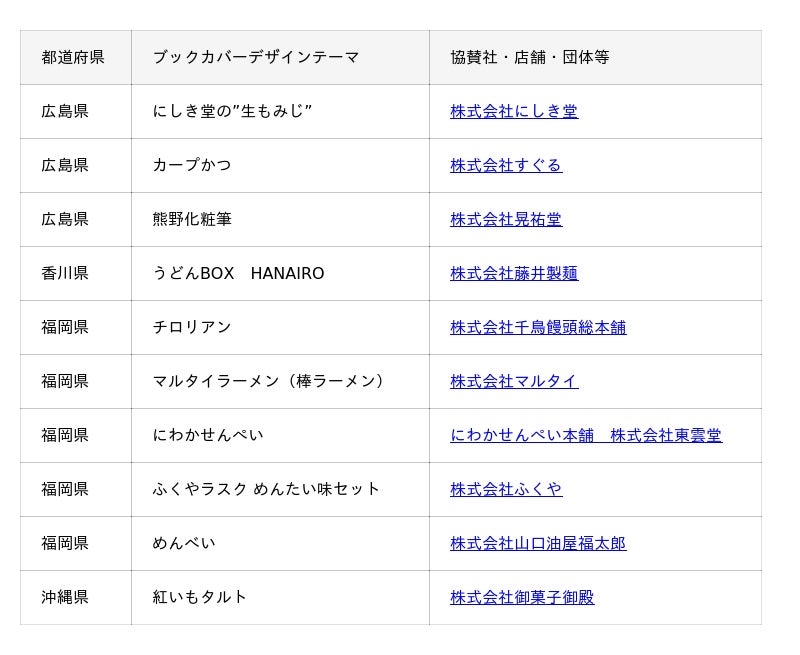 トーハンは、人と本とのタッチポイント創出を目指す中で、全国の自治体や企業と共に、地元書店の活性化と地域企業のPRに繋がる取り組みを実施しています。今回は各地の特産品メーカーと書店がコラボし、ご当地おみやげのブックカバーを配布いたします。- 配布方法:全国268書店で、期間中に文庫本をお買い上げの方に、地域ブロックごとに異なるデザインのブックカバーを配布いたします。