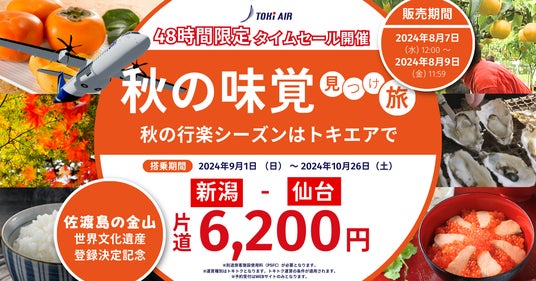 新潟拠点の地域航空会社トキエア株式会社(本社:新潟県新潟市 代表取締役:長谷川政樹、以下トキエア)は、2024年8月7日(水)12:00~8月9日(金)11:59の48時間限定で、「新潟=仙台」航空券のタイムセールを実施することをお知らせいたします。今回のタイムセールでは、2024年9月1日(日)~10月26日(土)に運航する便を対象に、片道6,200円の特別価格で販売いたします。