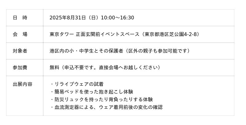 この度、機能性ウェアを販売する 株式会社りらいぶ(本社:宮城県仙台市、代表取締役:佐々木貴史)は、8月31日(日)、9月1日(月)に開催される防災啓発イベント『東京タワー親子防災物語9.01』に協賛いたします。当日は、弊社代表の佐々木がイベント実行委員長として登壇するほか、ブース出展を行い、リライブウェアの試着体験や、簡易ベッドを用いた抱き起こし体験などを実施いたします。