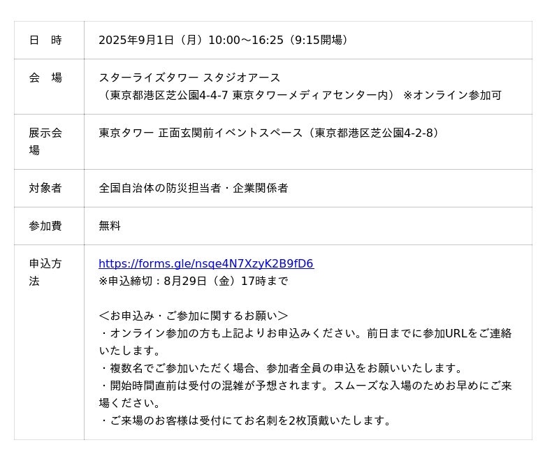 全国47都道府県をオンラインでつなぎ、地震や集中豪雨で被災した自治体の防災担当者や、防災事業に取り組む企業の担当者・防災の有識者とともに、官民連携の備災モデルを考えるシンポジウムです。シンポジウム会場に隣接する東京タワー正面玄関前イベントスペースでは、“備災”の技術やアイデアを先導する企業・団体による最新の防災設備やテクノロジーの展示・実演を行います。