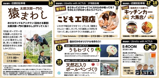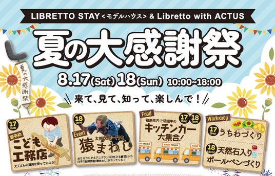 インテリアショップ「Libretto with ACTUS」 モデルハウス「LIBRETTO STAY」を会場に、直接専門家と相談する機会や、新築住宅や不動産、インテリアのアイデアを手に入れる絶好の機会となります。「こども工務店」や「太郎次郎一門の猿まわし」、「うちわづくりや天然石入りボールペンづくり」「キッチンカー」も登場し、家族みんなで楽しめるプログラムも充実しており、思い出に残る素敵な時間をお過ごしいただけるイベントとなっております。詳細につきましては、HPやInstagramをご参照ください。