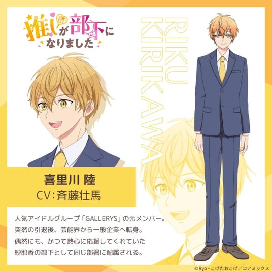 本作の注目ポイントは、元アイドルの新入社員“陸”を人気声優・斉藤壮馬さんが演じることです。「もし自分の推しが部下になったら…?」という誰もが一度は夢見るような設定を、アニメらしいテンポと臨場感で描きます。