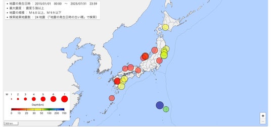 下図は、直近の約10年(2015年1月1日~2025年7月31日)の間に、震度5強以上/M6.0以上の地震が観測されたエリアを可視化したマップです。他エリアと比べて、中部地方での観測が少ないことがわかります。