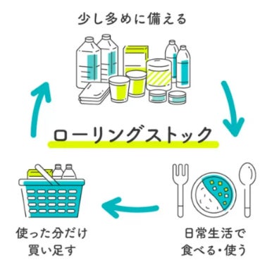 日常的に使う食品や消耗品を少し多めに備蓄し、消費した分だけ定期的に買い足していくことで、常に一定量の備蓄(ストック)を保つ方法が「ローリングストック」です。日本で生まれた独自の備蓄方法であり、「循環備蓄」と呼ばれることもあります。