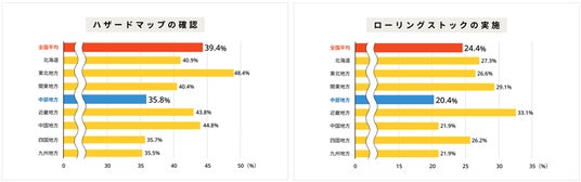 対して中部地方に着目すると、「ハザードマップの確認(35.8%)」や「ローリングストックの実施(20.4%)」が、顕著に低い数値となっています。特にローリングストックの実施率は全国平均よりも4.0%低く、トップの近畿地方を12.7%下回りました。