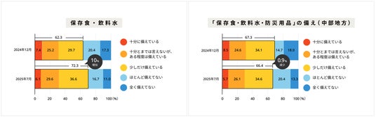 続いて、「保存食・飲料水」及び「防災用品」を自宅に備えているかを質問。「少しだけ備えている(36.6%)」「十分とまでは言えないが、ある程度は備えている(29.6%)」「十分に備えている(6.1%)」と答えた人の割合は72.3%となり、2024年12月時と比べ、10%の増加となりました。