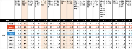 また、地方別にみると、特に東北地方は「ハザードマップの確認(48.4%)」や「停電時の対応(22.7%)」、「防災グッズの用意(43%)」などの項目において、他エリアよりも備えている割合が高く、東日本大震災の経験を踏まえてしっかりと対策している様子が見受けられます。