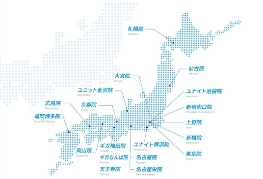 当グループは提携院を含め、北海道(札幌)、東北(宮城・仙台)、関東(東京、埼玉、神奈川)、北陸(金沢)、中部(名古屋、栄)、関西(大阪、京都)、中国(広島、岡山)、九州(福岡・博多)と全国に19院展開しております。