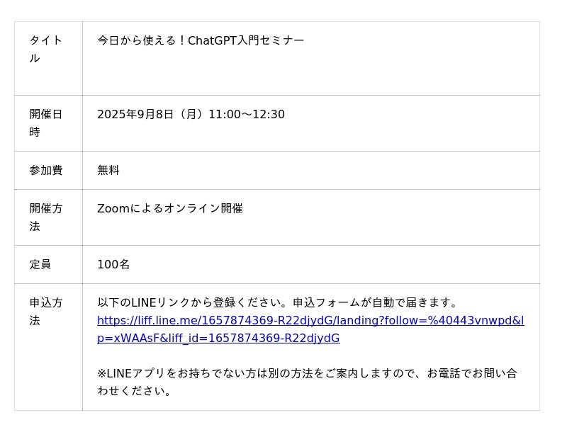 本セミナーでは、いま注目の生成AI「ChatGPT」を日常生活や仕事にどう取り入れるかを、初心者の方にもわかりやすく解説。実際の操作画面を見ながら、活用方法を実践形式で体験いただけます。