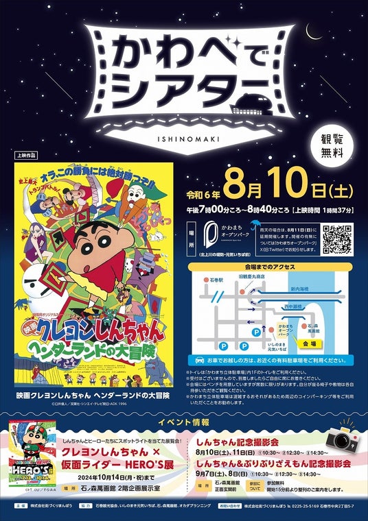 宮城県石巻市のまちなかを流れる北上川の堤防上から萬画館をスクリーンにして楽しむ野外上映会。今回の上映作品は「クレヨンしんちゃんヘンダーランドの大冒険」。入場無料。暑さ対策をしながらみんなで楽しもう!!