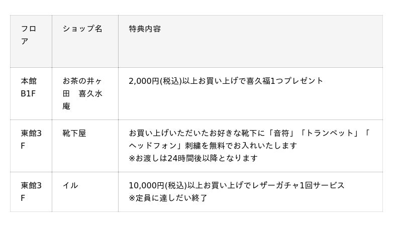 他、約20ショップにて特典をご用意しております。詳細は、店頭ポスターまたはエスパルHPをご覧ください。