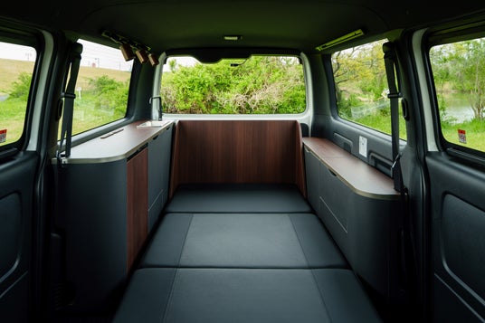 このキットはキャンピングカーの装備を備えつつ、通常の買い物やレジャーに荷室を広く使えることが特徴で、さらに車体の改造を施していないため車体のメンテナンスは一般の