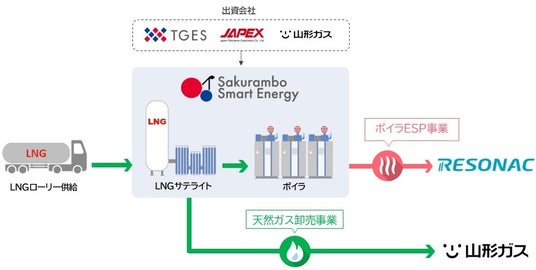 本取り組みは、2025年5月にさくらんぼSEをTGES、JAPEX、山形ガスが共同で設立し、本工業団地内で操業中のレゾナック・ハードディスク山形工場内に、さくらんぼSEが新たにLNGサテライト設備とボイラを設置し、エネルギーサービス[*4]を実施します。本年9月にLNGサテライト設備建設に着手し[*5]、2026年5月の供給開始を目指します。また、同一のLNGサテライト設備[*6]を通じ、さくらんぼSEから山形ガスへの天然ガス卸売事業も予定しております。