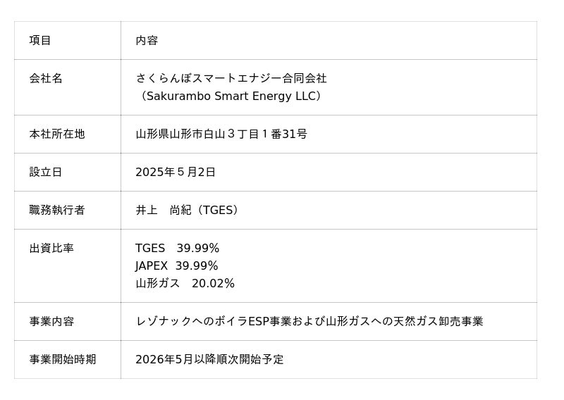 さくらんぼスマートエナジー合同会社(職務執行者:井上 尚紀、以下「さくらんぼSE」)、東京ガスエンジニアリングソリューションズ株式会社(社長:小西 康弘、以下「TGES」)、石油資源開発株式会社(社長:山下 通郎、以下「JAPEX」)、山形ガス株式会社(社長:永井 悟、以下「山形ガス」)、株式会社レゾナック・ハードディスク(社長:真壁 保志、以下「レゾナック・ハードディスク」)は、このたび、東根大森工業団地(以下「本工業団地」)における複数事業者連携による天然ガスへの燃料転換(以下「本取り組み」)に着手しました。