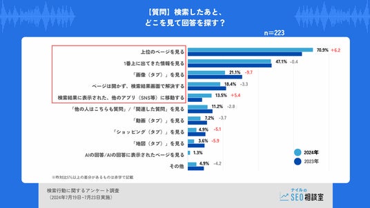 検索後に回答を探す場所として、新たに「AIの回答/AIの回答に表示されたページ」を追加しましたが、1.3%ほどにとどまりました。Googleは、現在米国で実装されている「AI Overview」を、年内に日本でも展開予定のため、「ナイルのSEO相談室」では、今後の検索行動の変化についても調査してまいります。