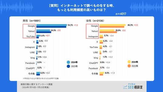 一方で、男女別データで比べると、変化が最も大きかったものは、男性「YouTube(6.4%)」で前年比2.1%の増加、女性は「Yahoo!(25.9%)」で前年比5%の減少傾向が見られました。