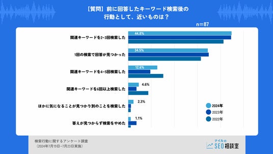 上記で回答いただいた87名に、先ほど回答したキーワードを検索した後の行動として近いものを聞いたところ、約半数が「関連キーワードを2~3回検索した(44.8%)」と回答しました。