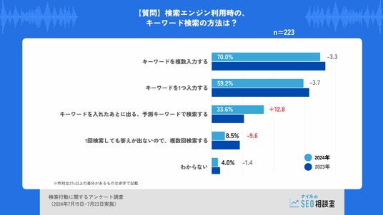検索エンジン(Google、Yahoo!など)を利用して調べものをする男女223名のうち、キーワードの検索方法として最も多かったのは「キーワードを複数入力する(70%)」、次いで「キーワードを1つ入力する(59.2%)」「キーワードを入れたあとに出る、検索候補で検索する(33.6%)」と回答しました。