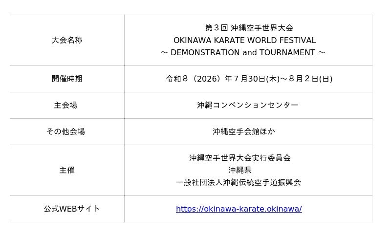 令和8年開催の大会名称は、「第3回 沖縄空手世界大会 OKINAWAKARATE WORLD FESTIVAL~DEMONSTRATION and TOURNAMENT~」とする。
