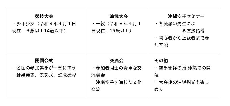 世界中の沖縄空手の愛好家が「空手発祥の地・沖縄」に集結し交流を深める場を創出するとともに、沖縄で先人たちが体系化し今日まで受け継がれてきた沖縄空手の技や精神性を今後も正しく保存・継承し、沖縄空手の将来にわたっての振興を図ることを目的に、沖縄空手世界大会を開催する。1 大会名称