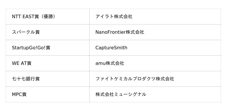 本イベントのDATERISE!PITCH CONTEST2025では、出場したスタートアップ11社の中から放射線治療AIスタートアップのアイラト株式会社が優勝し「NTT EAST賞」として海外のアクセラレーターによる現地プログラムが授与されました。また、NanoFrontier株式会社、CaptureSmith、amu株式会社、ファイトケミカルプロダクツ株式会社、株式会社ミューシグナルに対して協力企業・団体より各賞が授与されました。