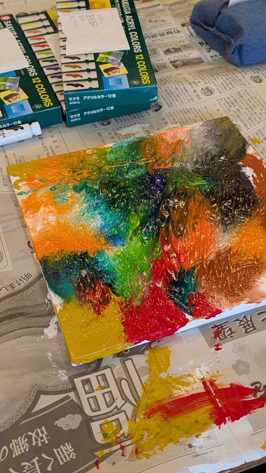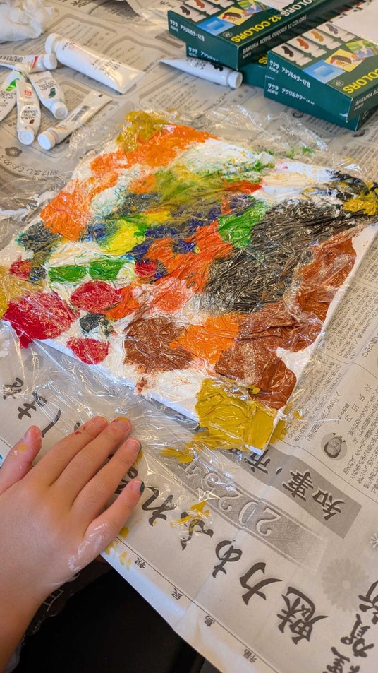 絵の具をたっぷりキャンバスにのせ、ラップ越しに手で押して広げていくスマッシュアート。