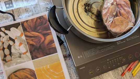 今回は玉ねぎの皮を使った染色。布を輪ゴムで絞り、煮出した染液に浸けると、あたたかみのあるオレンジ色が広がります。 「玉ねぎでこんな色が出るなんてびっくり!」と驚く参加者も。
