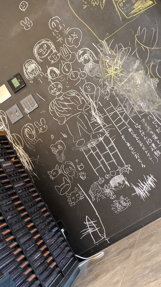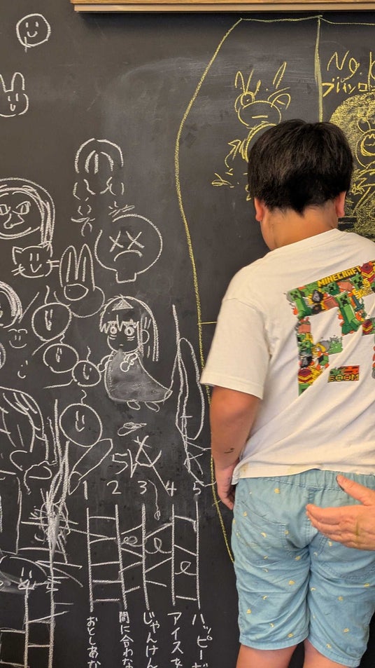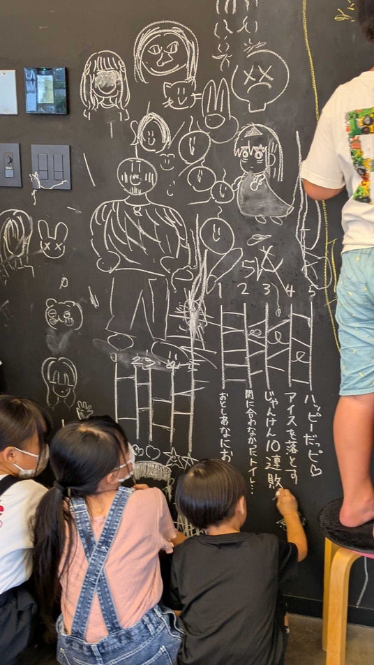 会場の黒板には、子どもたちが思い思いにイラストを描き込みました。