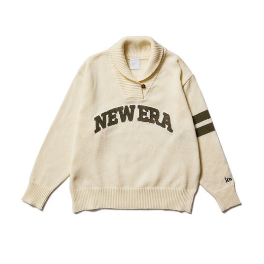 ざっくりとしたローゲージのショールカラーセーター。フロントのアーチロゴはフェルトワッペンでデザイン。