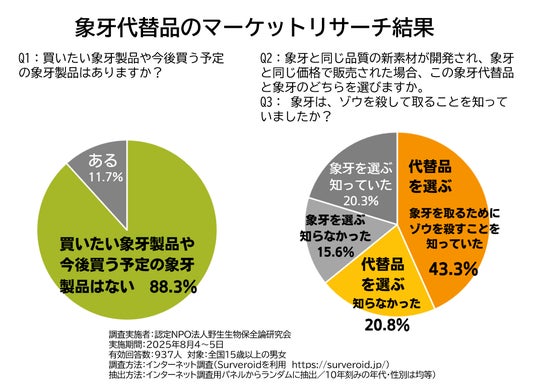 ・「象牙と同じ品質の新素材が開発され、象牙と同じ価格で販売された場合、象牙代替品を選ぶ」と64.1%が回答