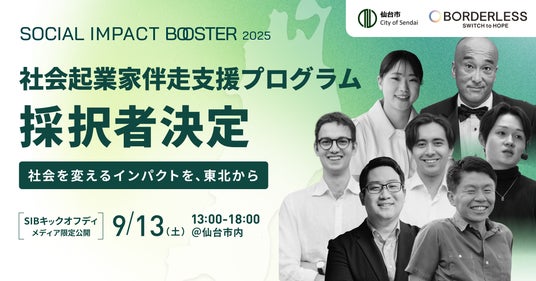 株式会社ボーダレス・ジャパン(所在地:福岡県福岡市、代表取締役CEO:田口一成、以下:当社)は、仙台市主催、当社が企画・運営を行う仙台・東北地域の社会起業家を対象としたアクセラレーションプログラム「TOHOKU SOCIAL IMPACT BOOSTER(以下、SIBプログラム)」において、6組の採択者を決定したことをお知らせいたします。