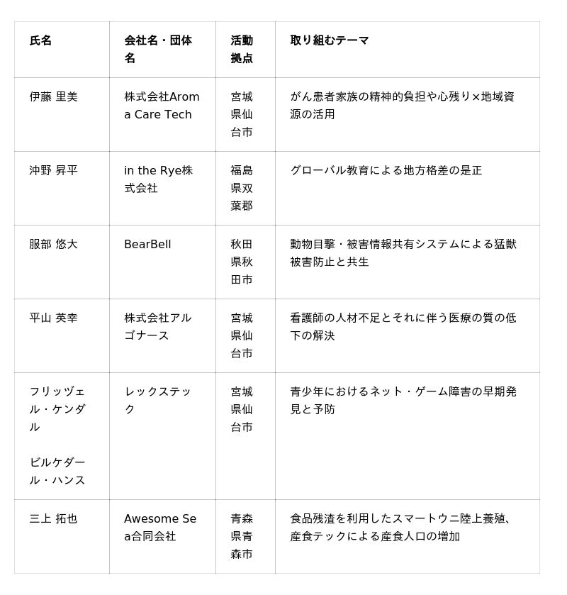仙台・東北地域を拠点に、様々な社会課題解決に取り組む6組の起業家が採択されています。(五十音順、敬称略)