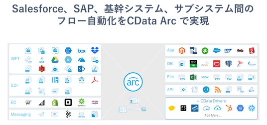- 多様なコネクタとフロー自動化を行うCData Arc で、エンタープライズで利用されるSalesforce、SAP とスクラッチシステムの連携や連携サブアプリ開発による自動化促進を実現します。