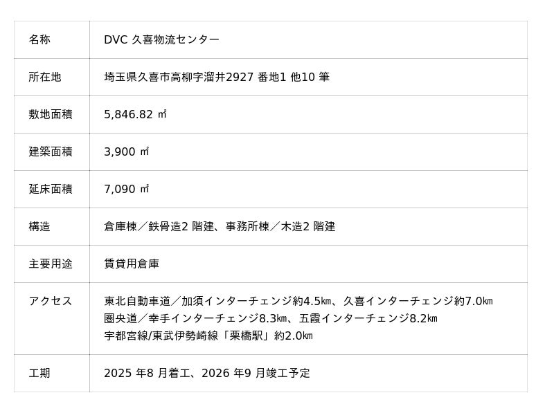 2025 年8 月19 日には、地鎮祭と決起集会を執り行い、加須・久喜両インターから30 分圏内の立地を活かして今後の流通需要に応える計画で、竣工は2026 年9 月を予定しています。(施主:DVC 久喜特定目的会社)