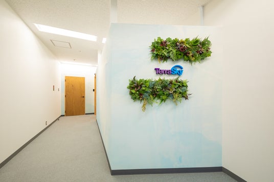 - 会社名、「テラスカイ」の名にちなんで、エントランスは大地と空のカラーリング