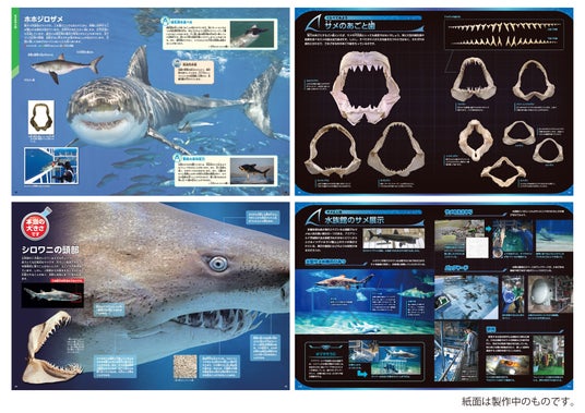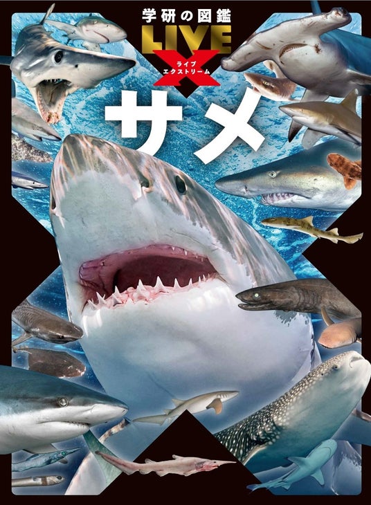 『学研の図鑑LIVEエクストリーム サメ』は、1冊まるごとサメの魅力を掘り下げる図鑑です。獰猛なもの、可愛いもの、深海にすむものなど…約100種もの多様なサメたちが大集合しました。歯、感覚器、繁殖、古代ザメなど、さまざまな角度からサメが“海の王者”と呼ばれる理由を徹底解説しています。また「サメの飼育種類数日本一(約60種)」で知られる「アクアワールド茨城県大洗水族館」の完全バックアップにより、大迫力の実物大撮りおろし写真やバックヤードの情報も収録。サメの多彩な魅力のつまった唯一無二の図鑑です。