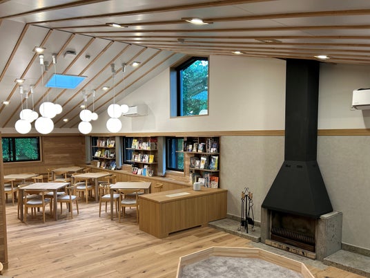 第一弾で予告していた町民向けの保養所が軽井沢に完成。当社は空間デザインに協力し、天然木を活かした内装や、世界中から選書した本棚など、子供たちの感性を刺激する工夫を随所に施しました。林間学校や英語合宿などの利用を想定し、室内での過ごし方にも配慮。境町の教育支援の一環として、職員や子供たちが心身を癒し、学びを深める場として活用されています。