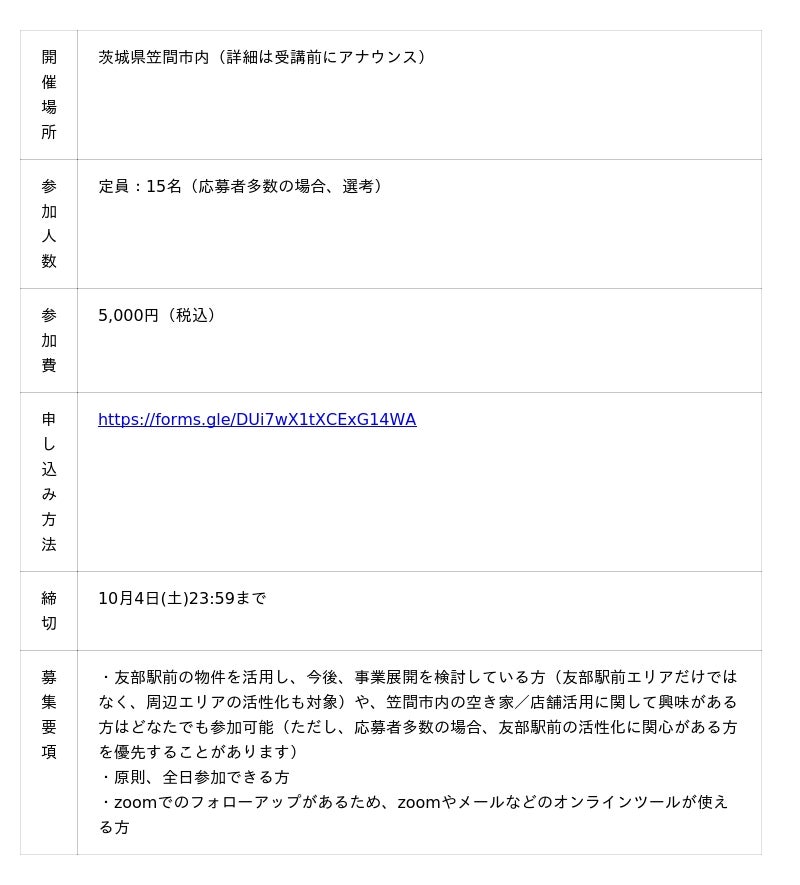 笠間市友部駅周辺エリアは、市の玄関口でありながら、近年の人口減少に伴い空き家・空き店舗が増加しています。笠間市としては、これらの遊休不動産を、地域で事業を起こしたい人材や新たな挑戦をしたい方々の活動拠点となる「地域資源」として捉え、空き家活用を通じた地域コミュニティの醸成により、友部駅周辺エリアの活性化と関係人口の創出を目指しています。■ 講座について