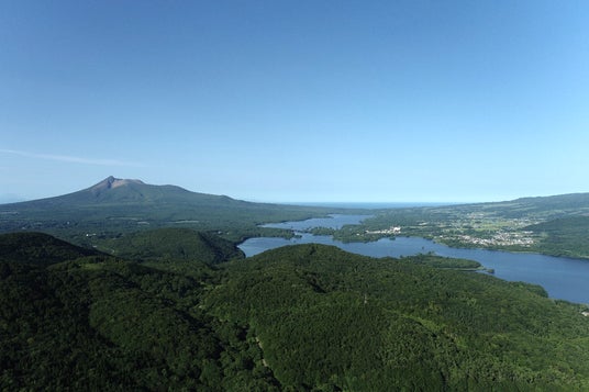 七飯町西大沼社有林の展望エリアから撮影した鹿部社有林の風景 (道南のシンボルである駒ヶ岳、大沼・小沼および鹿部飛行場の近隣に所在)