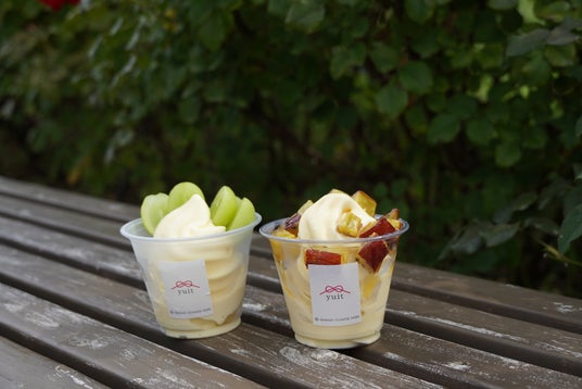 (バラ/バニラ/シャインマスカット、大学芋トッピングのソフトクリーム)