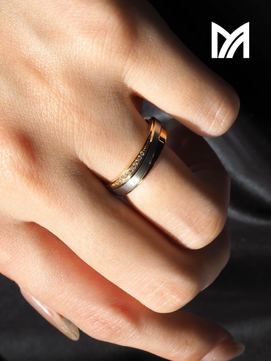 プラチナとゴールド、グロスと艶消し。マテリアルと表面仕上げのそれぞれにコンビネーションを取り入れたデザイン。2色のマテリアルに対し、クロスするようセッティングされたダイヤモンドが、絶妙なデザインバランスを生み出しています。