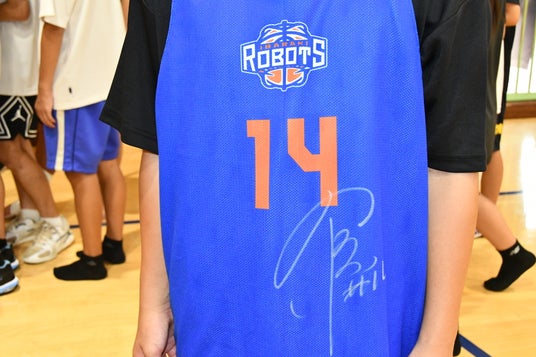 クリニック終盤には、遊び感覚でフリースロー練習ができる「ノックアウトシューティング」が行われ、勝者には久岡選手からユニフォームが贈呈されました。ユニフォームを受け取った生徒は、目をキラキラ輝かせて「今回をきっかけに茨城ロボッツを応援したい。会場に試合を応援しに行きたい。」と話しました。