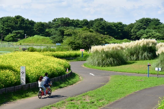 花畑のすぐ横を走るサイクリングコースは、花畑よりも少し低い位置にあります。特にトンネルの前後では両側から花畑に囲まれるような景観が広がり、自転車に乗りながら爽やかな景色がお楽しみいただけます。近くには駐輪場もあるため、自転車を降りてじっくり鑑賞することもできます。