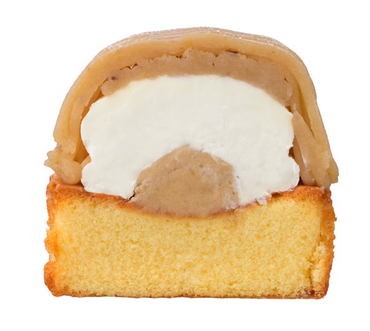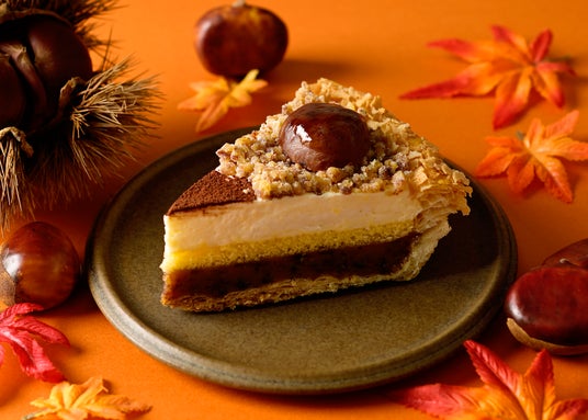 パイの上に渋皮栗ペーストクリームとカスタード入りクリームを重ね、上面にはクラッシュマロンを散らし、渋皮栗を飾りました。香ばしい渋皮栗とまろやかな甘さのカスタード入りクリームが生み出す、上品でコク深い味わいをお楽しみください。