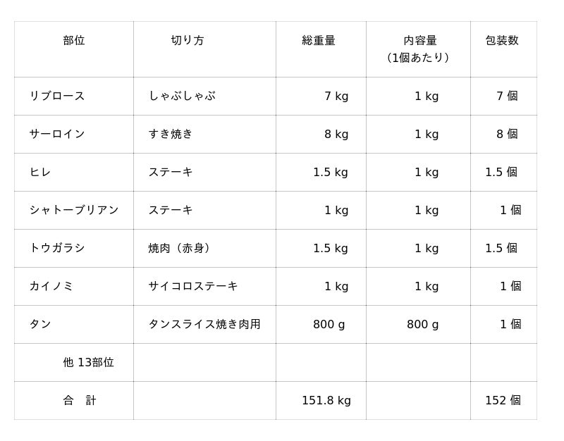 ロース、サーロイン、ヒレなど20部位(約150kg)をお届けします。希少部位のシャトーブリアン、トウガラシ、カイノミのほか、流通量の少ない牛タンなども含まれ、米沢牛の多彩な部位を網羅した贅沢な詰め合わせです。