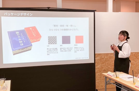 当日は、まずブランド立ち上げの背景や『牛かつサンド かさね物語』という名称に込めた想いを紹介しました。ブランドコンセプト「かさなり」を表現した外箱デザインについても取り上げ、円満や調和を象徴する七宝柄、知性と誠実さを示す藍色、あたたかさや安心感を表す珊瑚色といった意匠の意味を説明。参加者が熱心に耳を傾け、実際のパッケージに見入る様子も見られました。