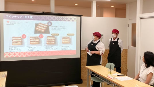 続いて、精肉専門店として培った知識と技術を活かした、他にはない牛かつサンドのこだわりをご紹介。山形県産雌牛のみを用い、部位ごとに最適なカットやトリミングを施すこと、オリジナルブレンドのかつソースや香ばしくトーストしたパンとの組み合わせなど、“肉そのものの魅力を引き出す工夫”をお伝えしました。