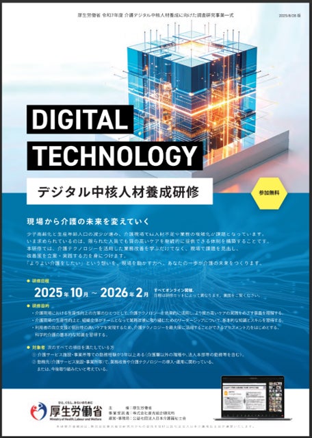 株式会社善光総合研究所(所在地:東京都港区南青山6-6-22、代表取締役社長:宮本隆史、以下「善光総研」)は、厚生労働省「介護デジタル中核人材養成に向けた調査研究事業一式」の受託事業として、2025年10月より「令和7年度 デジタル中核人材養成研修」を実施いたします。併せまして、厚生労働省より介護保険最新情報Vol.1416としてデジタル中核人材養成研修募集要項が公開されましたことをお知らせいたします。