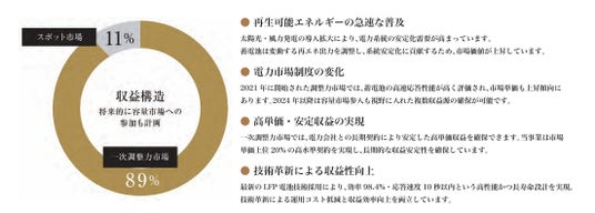 本ファンドの収益は、一次調整力市場での高単価契約を主軸 (約89%)とし、スポット市場取引(約11%)で補完する安定的な二本立て構造です。さらに将来的には容量市場への参入も計画しており、多様な収益源を確保していきます。 電力系統の脱炭素化が進む現在、系統用蓄電池の市場需要は今後10年で10倍以上に拡大すると予測されており、 先行者利益を確保できる有望な投資機会となっています。